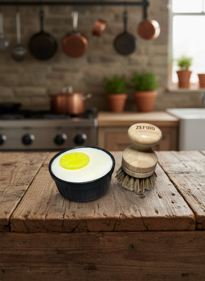 This set comes with 4+ oz of solid dish soap, scented with an orange citrus essential oil in a 4 oz cream ceramic ramekin.